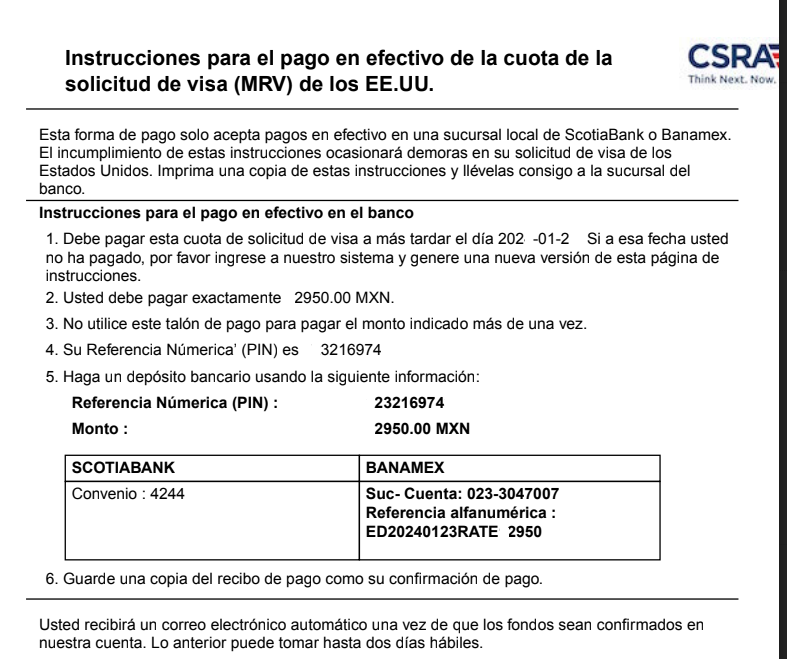 Mientras se realiza el trámite el consulado o emigración enviará notificación a su correo electrónico sobre la creación de la cuenta para la solicitud (Visa Láser, Pasaporte Americano, Sentri, etc.) y después recibirá una ficha de pago como lo muestra la imagen superior en donde está dirigida exclusivamente al consulado americano (Visa Láser). En los otros tramites (Pasaporte Americano, Sentri, Global) se realizará el pago en línea con tarjeta del solicitante y el cliente recibirá su cita y su recibo de pago de derechos de la solicitud. El pago de nuestros servicios se realizará antes de recibir la documentación a presentar en la cita/s.
